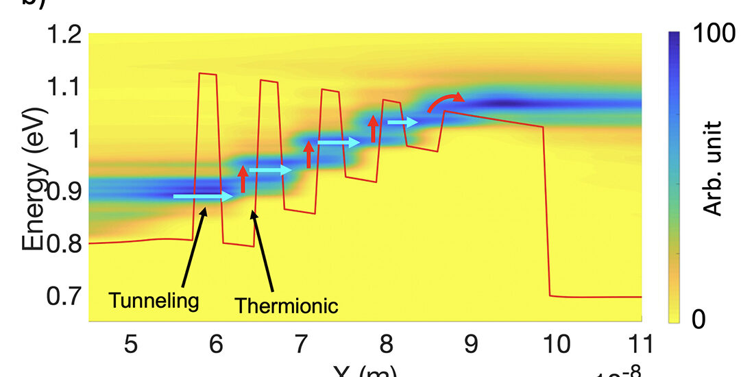 10 January 2022 Share Share on WhatsAppShare on WhatsApp Share on FacebookShare on Facebook Share on LinkedInShare on LinkedIn TweetShare on Twitter Project navigationPreviousPrevious project:Fig.1-a Representation of the semiconductor refrigerant heterostructure [Cha2005]. The quantum well of GaAs is cooled by injecting cold electrons (in blue) via resonant tunneling, and by extracting the hot carriers above the thicker barrier (in red).NextNext project:Fig.1: a) LDOS (arb. unit) of the quantum cascade cooler (QCC) calculated by NEGF. Horizontal and vertical arrows show the resonant tunneling and thermionic effects respectively. The green solid line represents the potential energy profile;